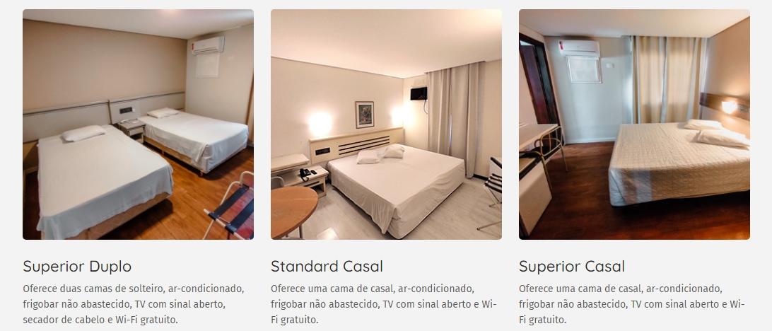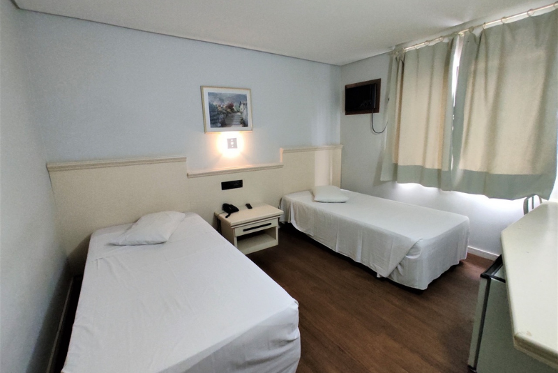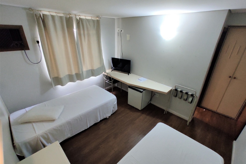 • Oferece uma cama de casal, ar-condicionado, frigobar não abastecido, TV com sinal aberto e Wi-Fi gratuito.